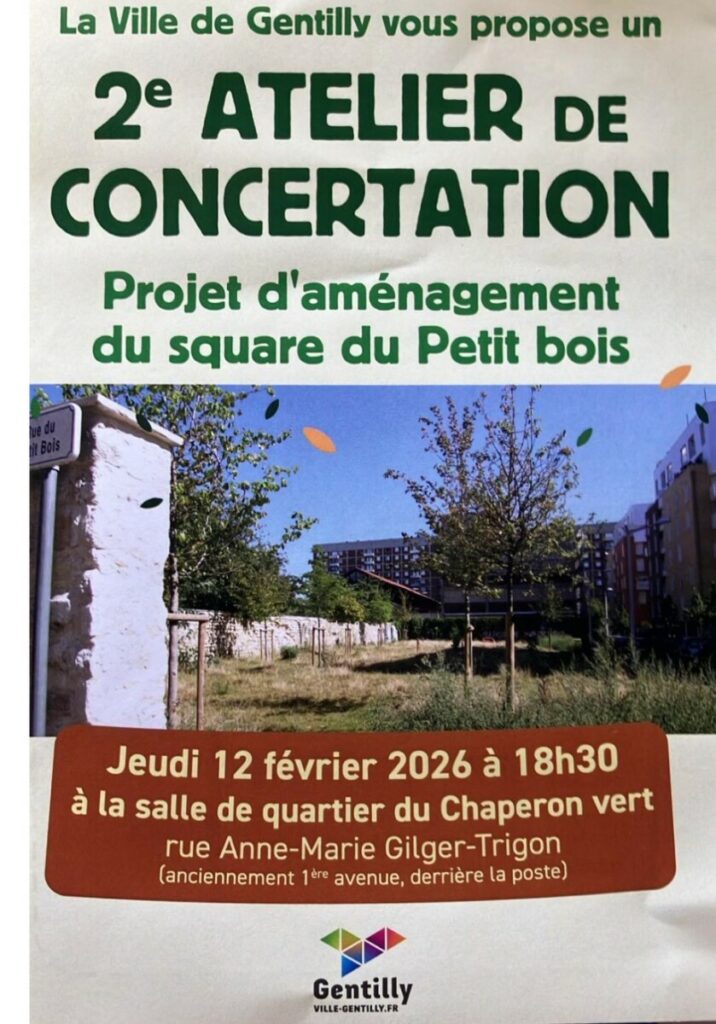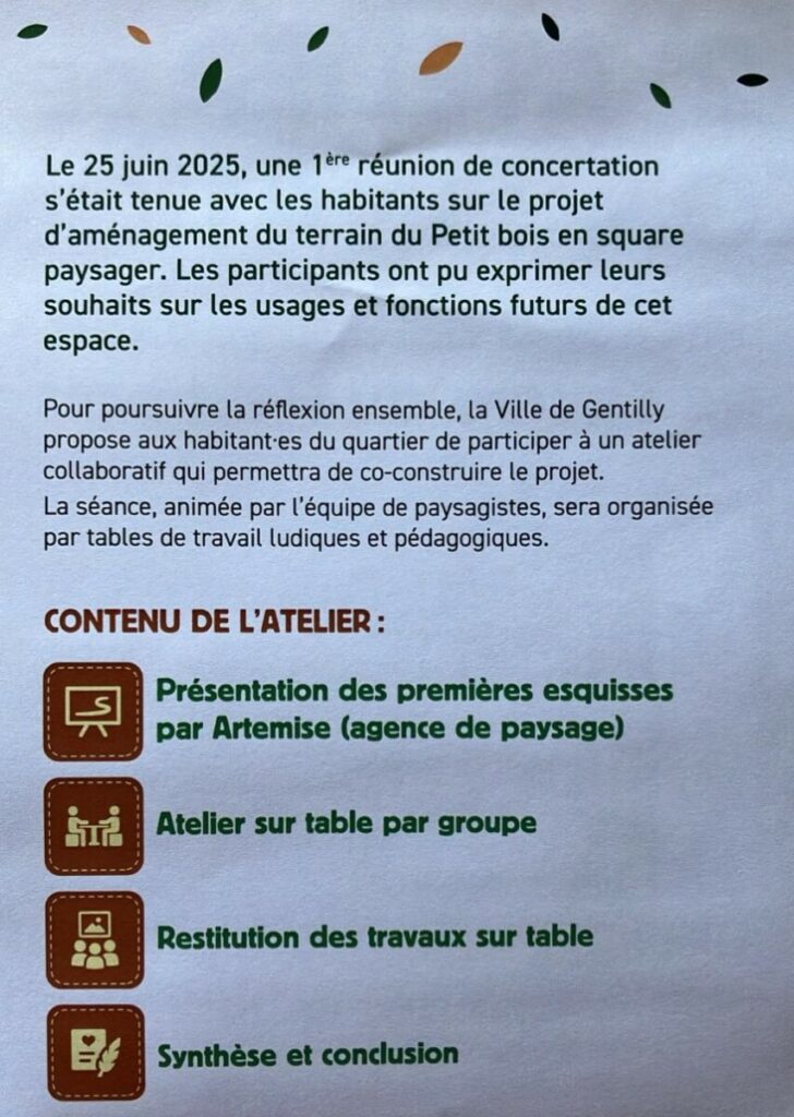 La ville de Gentilly propose aux habitants de venir au second atelier de concertation du projet d’aménagement du square du petit bois.